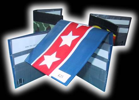 These Gaffa tape wallets are the latest 'must have' moneybags from the USA! Handmade in pure Gaffa tape they're tough, durable and will carry cards, change and notes. Choose from: Black with flames, Blue with white stars or Black with green cammo.